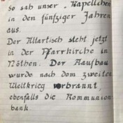 Weiterlesen . . .Zu der Zeit bestand die Ausrüstung der Feuwehr lediglich aus zahlreichen Eimern zur Brandbekämpfung und einigen Feuerhaken. Die Kapelle ist ein quadratischer Bau aus Bruchstein, deren Errichtung datiert man um 1750. Auf der 1950 angebrachten doppelflügeligen Türe steht der Spruch: „Regina pacis, ora pro nobis, Königin des Friedens, bitte für uns“. Auf dem Dach erhebt sich ein vergoldetes Kreuz, welches man von der Form her als Lothringer Kreuz bezeichnet. Die aus dem 18. Jhdt stammende Marienstatue besteht aus Lindenholz. Der Stifter Ferdinand Müller war mit einer jüdischen Frau verheiratet und hatte gelobt der Kapelle in Nöthen die Marienstatue aus dem 18. Jhdt. zu schenken, wenn seine Frau von der Verfolgung durch die Nationalsozialisten verschont bliebe. Die Statue war während des Krieges im Nöthener Wald versteckt. Nach dem Kriege löste er sein Versprechen ein.